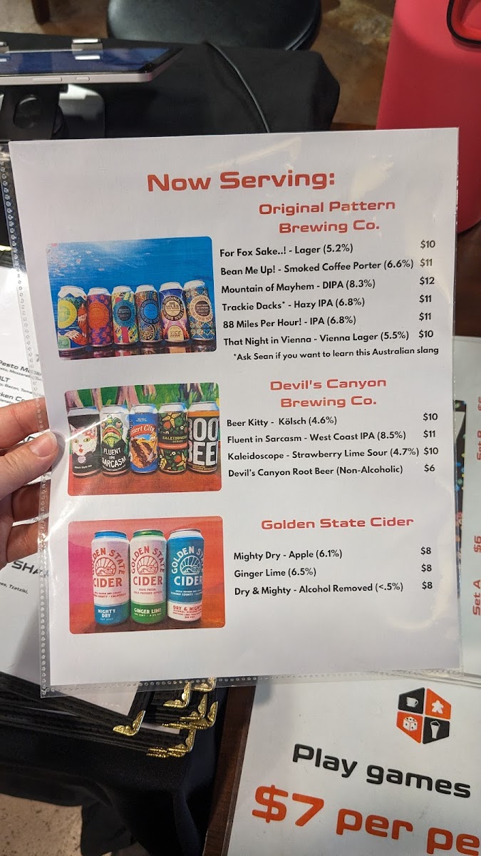 The dining experience here is equally remarkable. The cafe offers a diverse drink menu featuring craft beers from Original Pattern Brewing Co and Devil's Canyon Brewing Co. Enjoy a refreshing For Fox Sake..! Lager for just $10, or try the Mountain Of Mayhem DIPA for a hoppy kick at $12. If you're in the mood for something sweeter, sip on the Kaleidoscope Strawberry Lime Sour at $10 or indulge in their delicious non-alcoholic options like the Devil's Canyon Root Beer for $6. Recently, they've also revamped their menu to include food that pairs perfectly with your gaming sessions—satisfy your cravings while you strategize with friends!